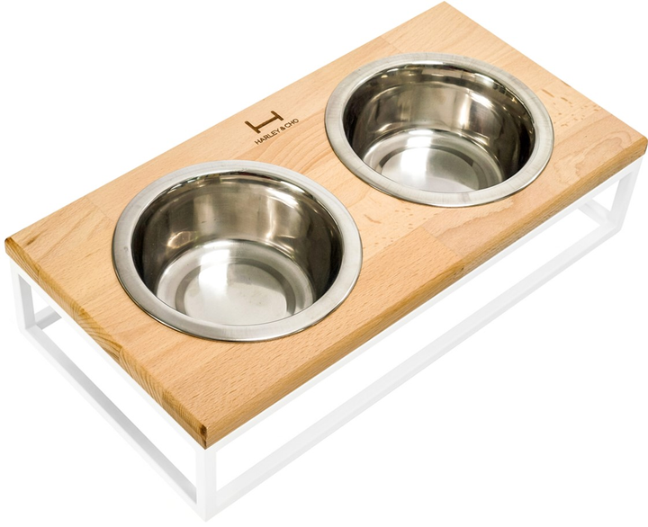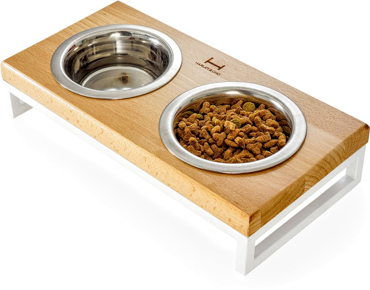 Миски на підставці Harley and Cho Lunch Bar Natural Wood. Колір натуральний + білий. Миски на підставці зі стільницею з натурального дерева дуже стильні і водночас надзвичайно стійкі - їх неможливо перекинути - вони зручні і прості у догляді. Миски зроблені в Німеччині, за європейськими стандартами якості, що не містять свинцю та інших небезпечних домішок екологічно чисті. Гармонійно поєднуються з інтер'єрі єром кухні, коридору або вітальні. Розміри мисок для маленьких і середніх собак чи котів XS (28x14x5 см) з об'ємом 0,2 літра, S (36x18x7 см) з об'ємом 0,45 літра, M (42x21x10 см) з об'ємом 0,75 літра, L (42x21x20 см) з об'ємом 0,75 літра.