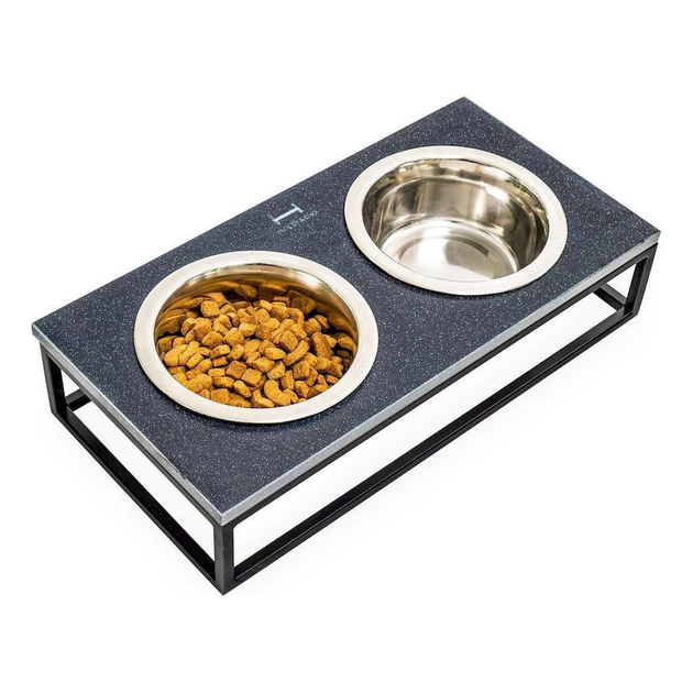Миски на підставці Harley and Cho Lunch Bar Biege Stone. Колір чорний камінь + чорний метал. Миски на підставці Harley and Cho LМиски на підставці зі стільницею з каменю - Стійкі - їх неможливо перекинути - Прості в догляді - Екологічні. Миски зроблені в Німеччині, за європейськими стандартами якості, що не містять свинцю та інших небезпечних домішок - Стильні. Гармонійно поєднуються з інтер'єрі єром кухні, коридору або вітальні Увага! Колір кам'янської яної стільниці (вкраплень в камені) може трохи відрізнятися від стільниці на фото. Все тому, що штучний камінь - лідер за кількістю відтінків і кожен новий камінь трохи відрізняється від попередніх Розміри мисок для маленьких і середніх собак чи котів: XS (28x14x5 см) Об'єм мисок: 0,2 літра S (36x18x7 см) Об'єм мисок: 0,45 літра M (42x21x10 см) Об'єм мисок: 0,75 літра. L (42x21x20 см) Об'єм мисок: 0,75 літра.
