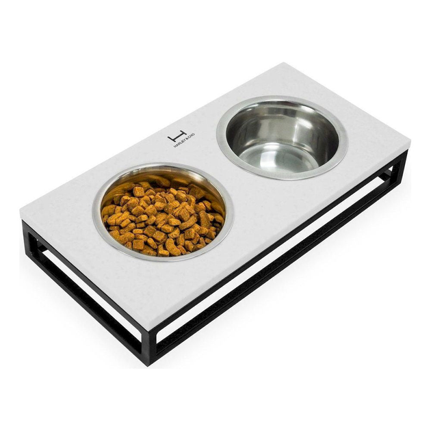 Миски на підставці Harley and Cho Lunch Bar White Stone. Колір білий камінь + чорні металеві ніжки. Миски на підставці зі стільницею з каменю - Стійкі - їх неможливо перекинути - Прості в догляді - Екологічні. Миски зроблені в Німеччині, за європейськими стандартами якості, що не містять свинцю та інших небезпечних домішок - Стильні. Гармонійно поєднуються з інтер'єрі єром кухні, коридору або вітальні Увага! Колір кам'янської яної стільниці (вкраплень в камені) може трохи відрізнятися від стільниці на фото. Все тому, що штучний камінь - лідер за кількістю відтінків і кожен новий камінь трохи відрізняється від попередніх Розміри мисок для маленьких і середніх собак чи котів: XS (28x14x5 см) Об'єм мисок: 0,2 літра S (36x18x7 см) Об'єм мисок: 0,45 літра M (42x21x10 см) Об'єм мисок: 0,75 літра. L (42x21x20 см) Об'єм мисок: 0,75 літра.