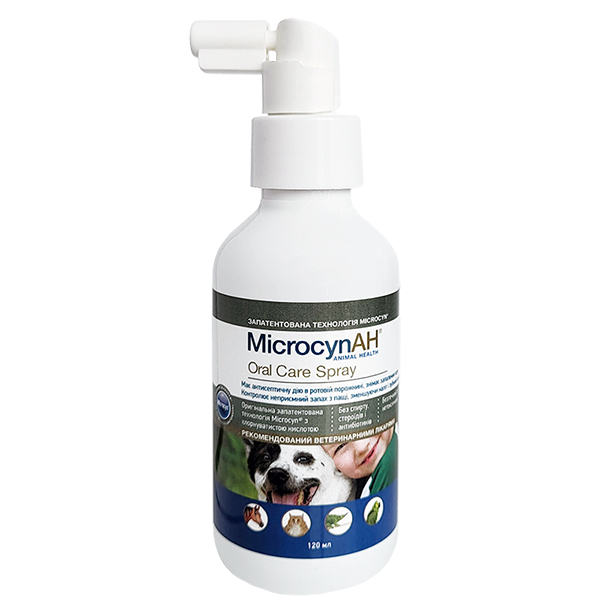 Спрей для догляду за пащею Microcyn Oral Care виготовлений на основі запатентованої технології Microcyn® із хлорноватистою кислотою та схвалений до застосування ветеринарами. Це простий у застосуванні засіб, чинячи антибактеріальний вплив на порожнину пащі тварини, позбавляє зубного нальоту і допомагає контролювати його появу надалі, а також профілактує утворення зубного каменю. Також спрей ефективно знімає запалення ясен та ліквідує неприємний запах з пащі.