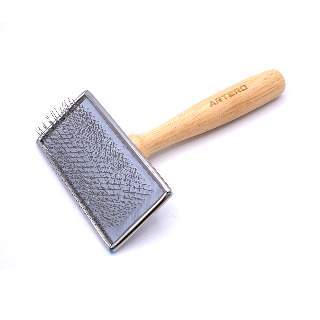 Пуходерка-слікер Artero за розміром ідеально підходить для дрібних порід, таких як шпіц, мальтійська болонка, йоркширський тер'єр і інші породи. Дуже добре підходить для розчісування навколо очей, носа і рота. Досить м'яка для повсякденного використання вдома, та досить міцна для повсякденного використання в салоні. Невелика дерев'яна ручка. • ширина 6см, довжина 4,5 см •