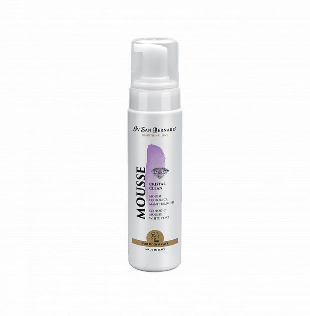 Мус Iv San Bernard Cristal Clean для видалення окиснення з шерсті, 250мл. Мус призначений для собак і кішок білого, блакитного, чорного і печінкового забарвлень. Перешкоджає окисленню вовни, усуває жовтизну і бурі плями, повертає природний колір і блиск шерсті. Зручний для локального застосування, особливо на мордочці і лапках.