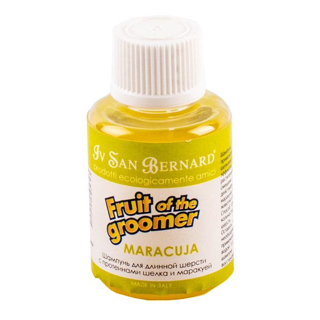 Шампунь Iv San Bernard Maracuja для довгої шерсті, з протеінами шовку та маракуєю, 30мл. Шампунь з протеїнами призначений для довгошерстих собак та кішок, ідеально підходить для частого застосування. Прекрасно видаляє забруднення, усуває статику, надає шерсті шовковистість і блиск, має оживляючий ефект. Корисні властивості активних рослинних компонентів маракуї в поєднанні із захисною та зміцнюючою дією протеїнів забезпечують інтенсивний догляд за шерстим покривом.