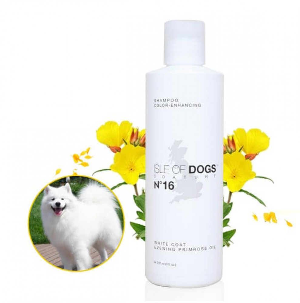 Isle of Dogs з оліэю вечірньої примули №16 - спеціальний шампунь для білої шерсті, який повертає природний колір та благотворно впливає на шкіру вихованця. Він підходить також для кремових та плямистих собак. Це професійний шампунь для білих собак зручно використовувати не тільки в салоні грумінг, але і в домашніх умовах. Він не вимагає спеціальної підготовки та не шкодить здоров'ю тварини. Догляд за білою шерстю собак разом із шампунем №16 стане безпроблемним та результативним. Може бути розведений водою у співвідношенні 1:10. Доступний в об'ємах: 50мл, 250мл, 1л, 3,78л (галон)