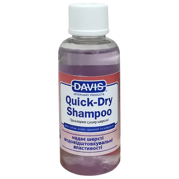 Шампунь Davis Quick-Dry допоможе вам якісно і швидко помити собаку або кота. Унікальна формула цього шампуню дозволяє вдвічі скоротити час купання і сушіння. Ефект грунтується на тому, що, по-перше, шампунь не містить загусників, а це забезпечує швидке піноутворення і легке змивання. По-друге, завдяки особливим компонентам складу шерсть отримує водовідштовхувальні властивості, тому час сушки значно скорочується.