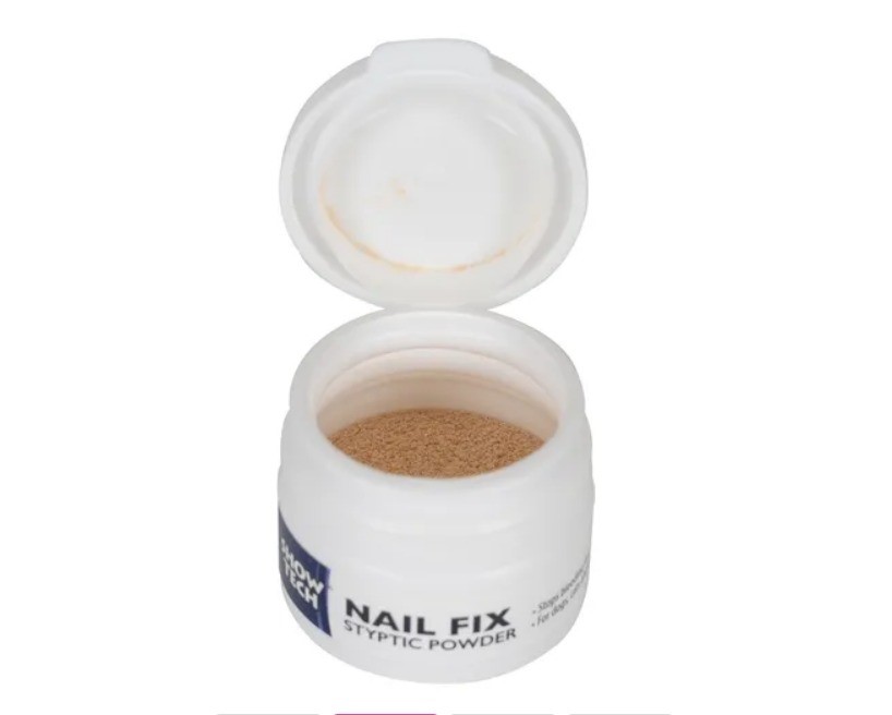 Геніальний препарат у вигляді кровоспинного порошку, який швидко зупиняє кровотечу. Він працює, підтримуючи згортання крові та зупиняючи кровотечу в місці нанесення. Він працює швидко і просто і є блискучою підмогою в разі раптової кровотечі під час стрижки нігтів. Просто нанесіть щіпку порошку на ділянку, що кровоточить, застосовуючи помірний тиск, поки кровотеча не зупиниться. Обов'язково не тріть травмований ніготь, так як тертя прискорює кровотечу. Якщо ви хочете, щоб ця процедура пройшла гладко, варто заздалегідь підготувати тримач Show Tech Stop Bleeding Holder, наповнений Nail Fix і паперовим рушником. Якщо є кровотеча, можна швидко її зупинити.