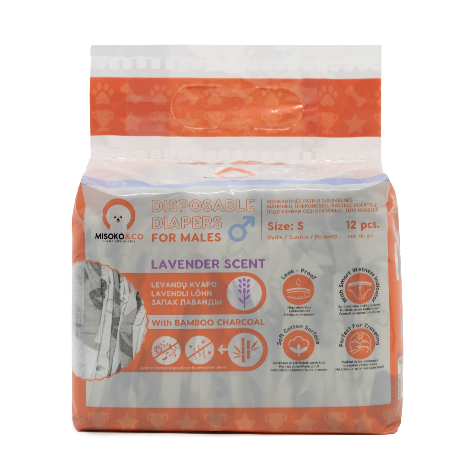 Misoko&Co одноразові підгузки для кобелів з вугіллям, індикатором вологості та ароматом лаванди (цуценята) – практичне та зручне рішення для запобігання сечовипусканню в недозволених місцях. Підгузки винятково зручні у використанні та виглядають грайливо!