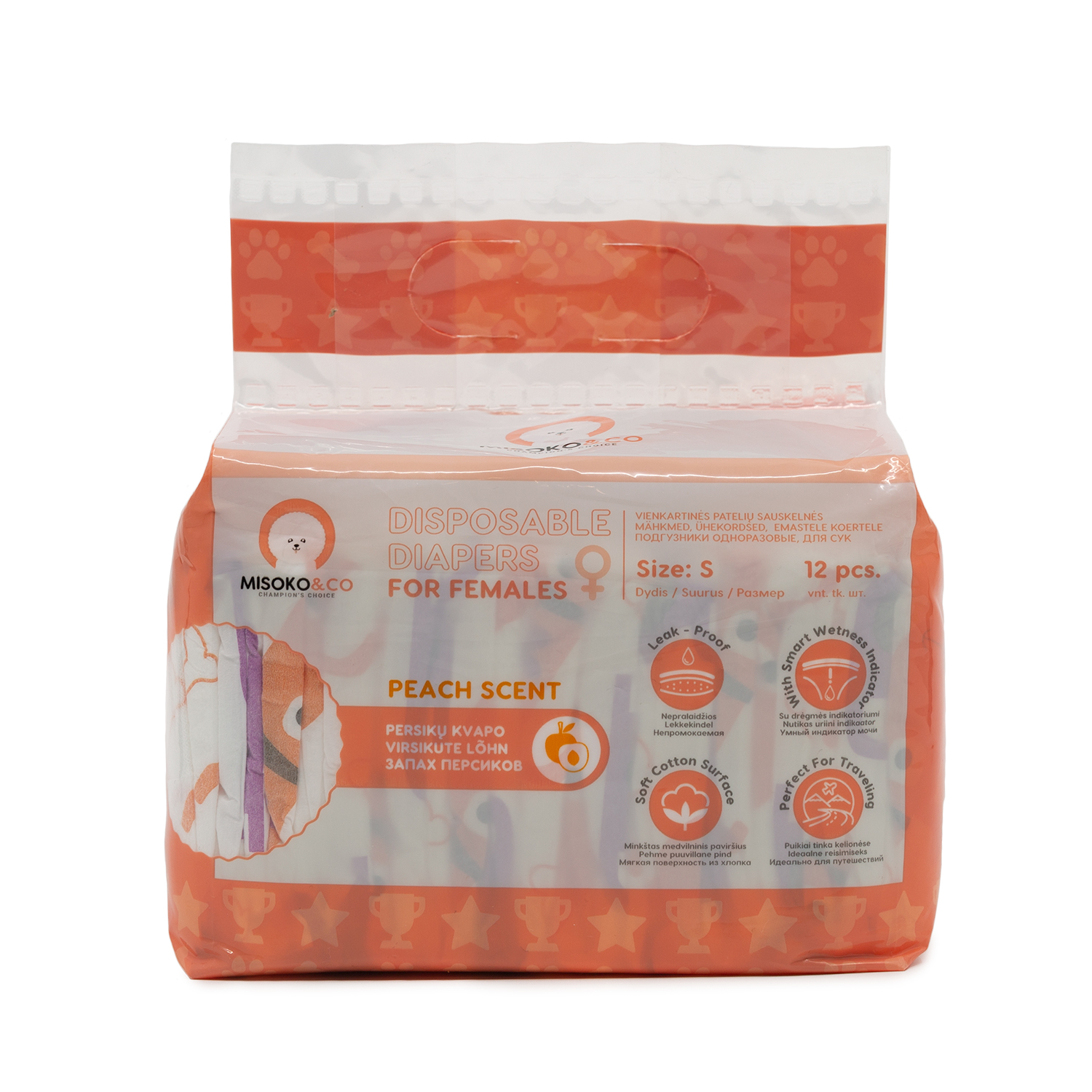 Misoko&Co одноразові підгузки для собак-сук з індикатором вологості та ароматом персика (цуценята та кісточки) – практичний та ефективний гігієнічний засіб для періоду тічки. Підгузки винятково зручні у використанні та виглядають забавно!