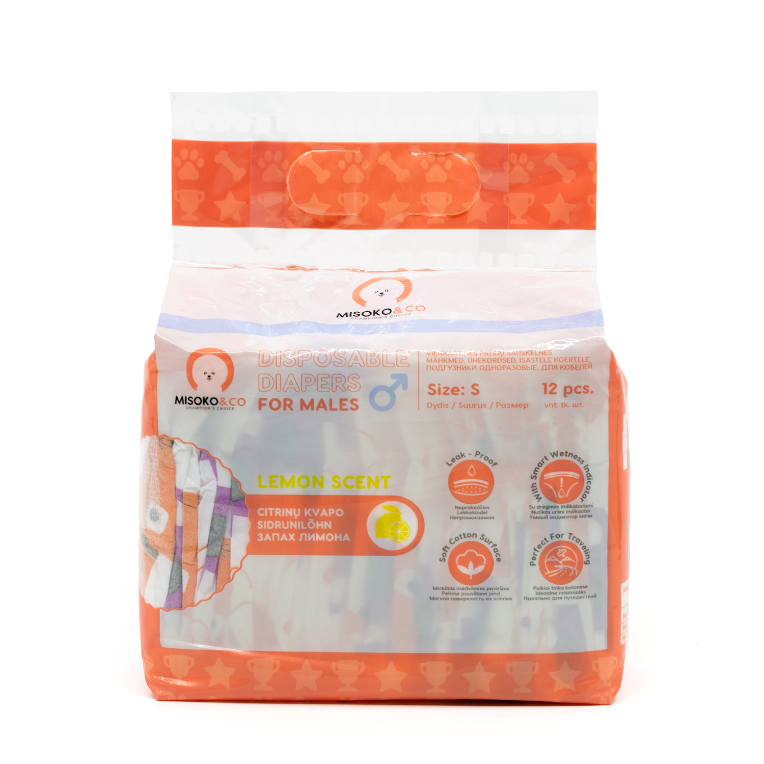 Misoko&Co Одноразові підгузки для кобелів з індикатором вологості та ароматом лимона (цуценята та кісточки), S