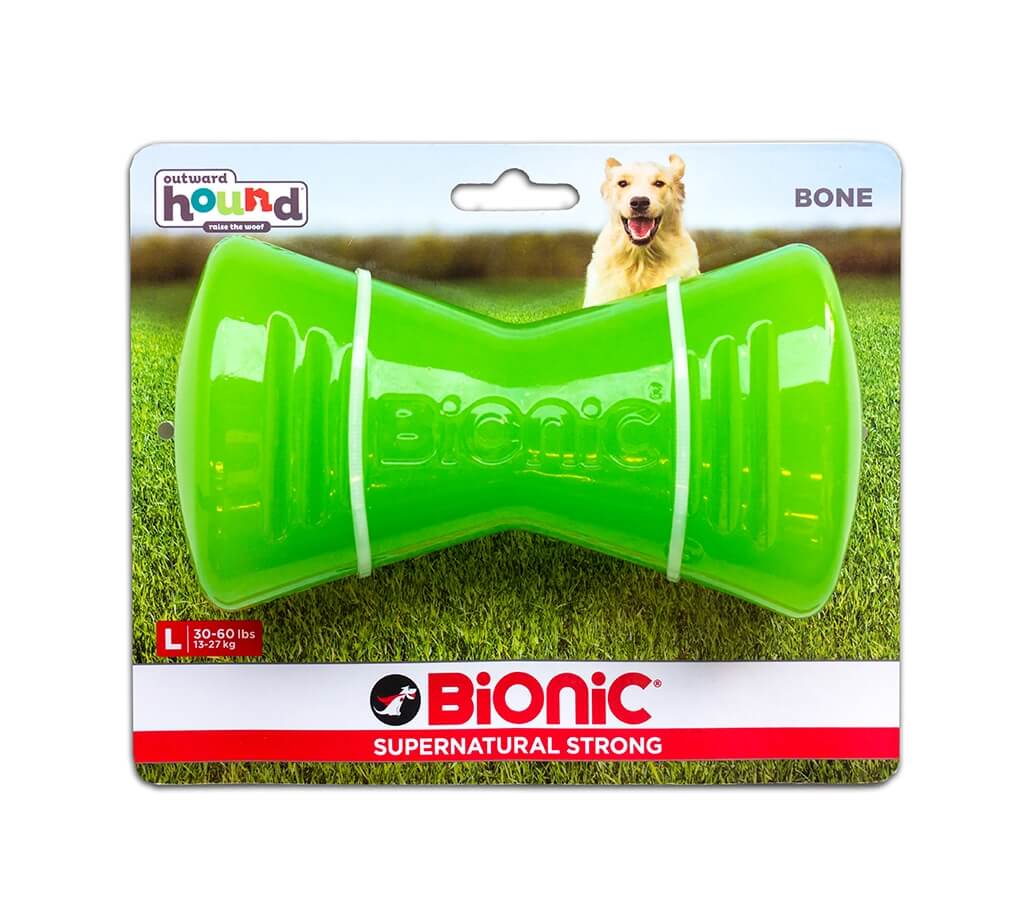 Біонік Опак Бон кістка зелена - надміцна іграшка для собак,що люблять гризти. Масивна форма іграшки Біонік Опак Бон повністю задовольнить вашого вихованця у бажанні погризти та пожувати, а потовщені виступи на найбільш привабливих для жування частинах іграшки стимулюють та посилюють відчуття! Іграшка має яскраві кольори, легко помітні навіть на відстані, тому ви не загубите Bionic, граючись у траві, снігу чи будь-якій локації на відкритому просторі! Дві схованки для ласощів з обох кінців кісточки ще більше розпалять азарт вихованця під час гри та жування.
