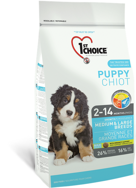 Сухий корм для цуценят середніх і великих порід 1st Choice зі смаком курки -це супер преміум корм на основі м'яса курки для цуценят середніх і великих порід вагою від 9,5 кг віком від 2 до 14 місяців. Корм 1st Choice містить необхідну кількість протеїнів, вітамінів і мінералів для оптимального росту та розвитку цуценят середніх і великих порід.