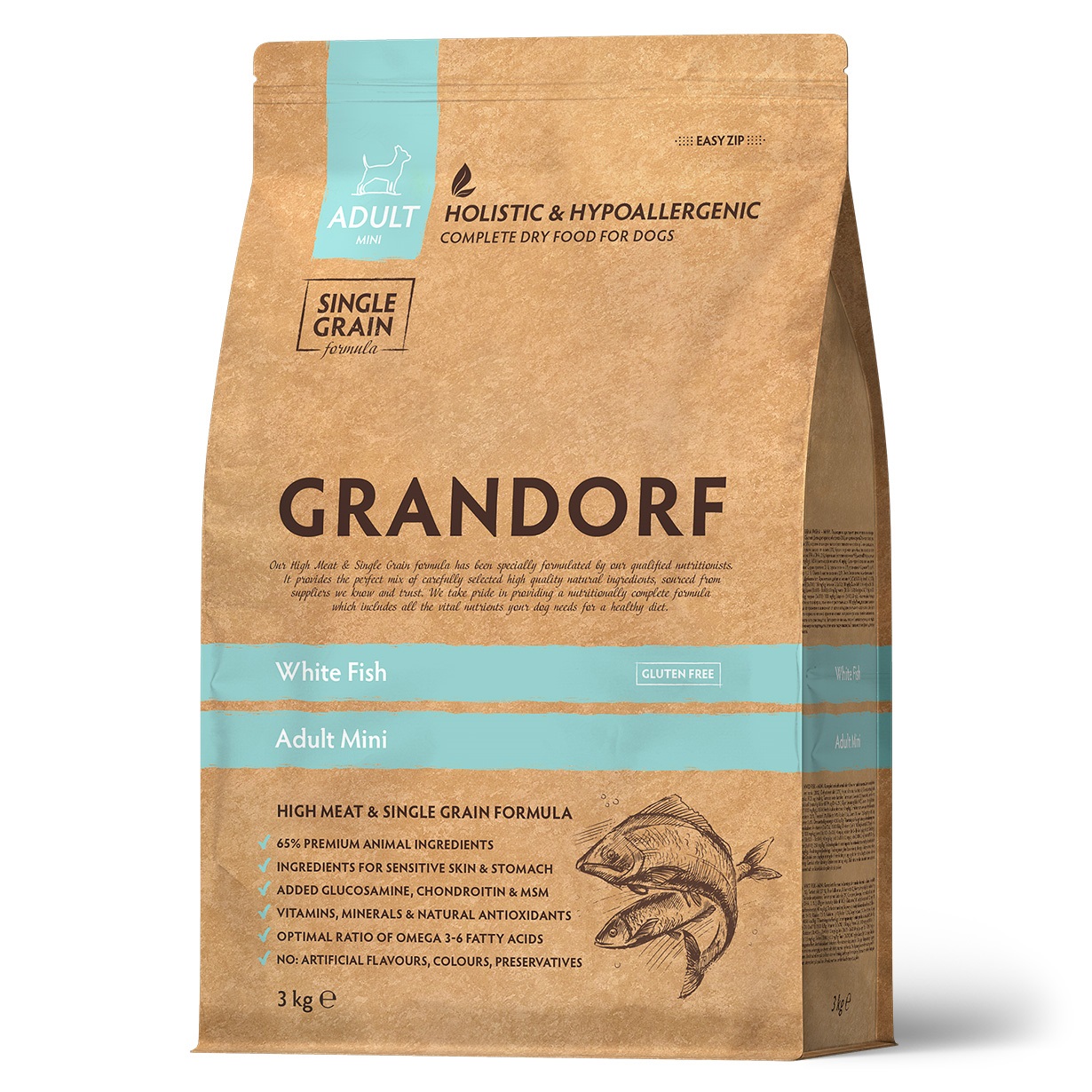 Низькозерновий склад і натуральні гіпоалергенні інгредієнти у поєднанні з дієтичним м'ясом білої риби допомагають запобігти алергічним реакціям та харчовій непереносимості, забезпечуючи імунне та харчове здоров'я.