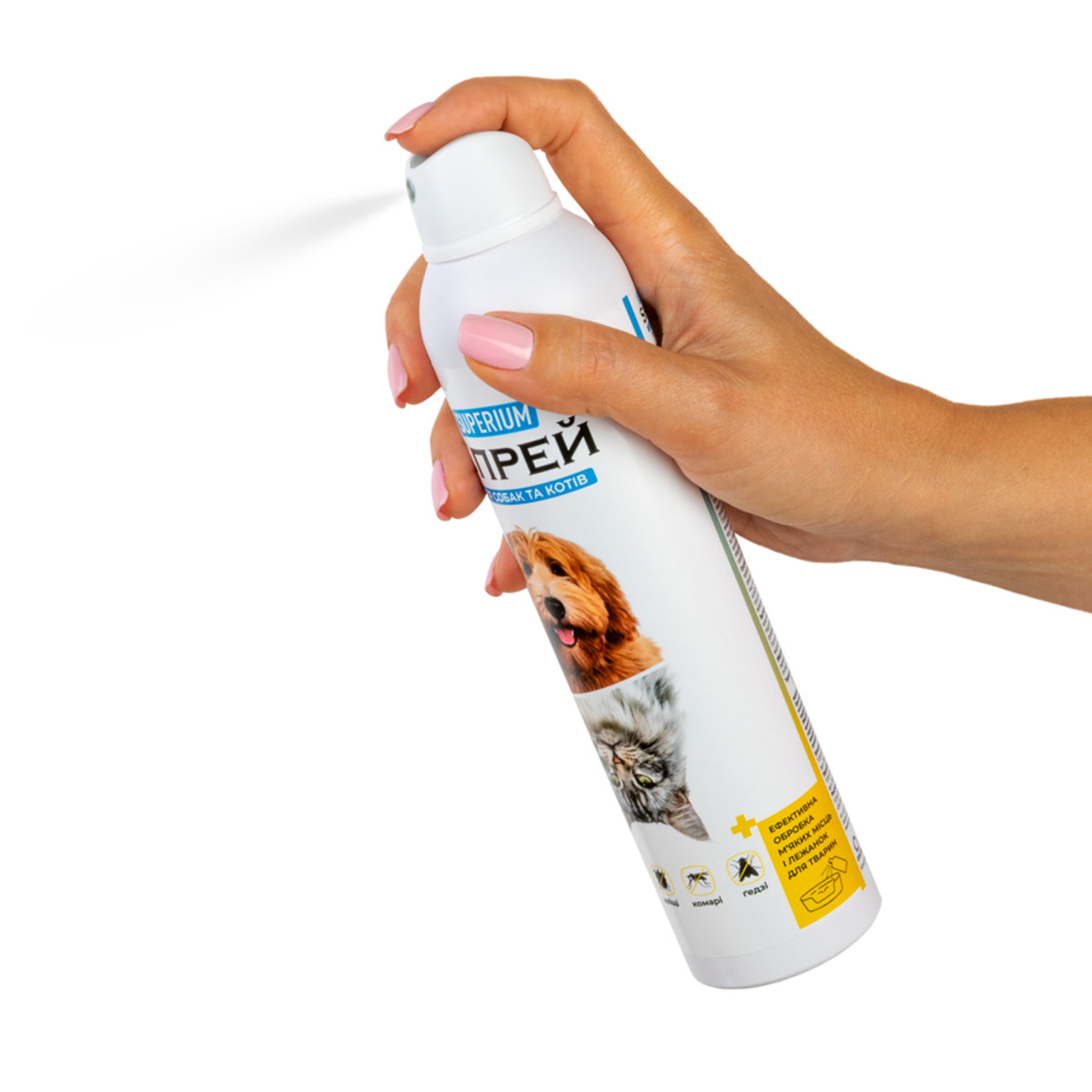 SUPERIUM Спрей застосовується зовнішньо шляхом обробки тіла тварини проти росту шерсті, злегка зволожуючи її (у довгошерстих порід шерсть підіймати рукою), з відстані приблизно 10-20 см. Довгошерстим тваринам розчесують шерсть, щоб препарат проник до самої шкіри на спині, боках, животі, лапах, загривку та хвості. Для обробки морди тварини нанесіть спрей на руку в рукавиці й м’яко втирайте препарат в шерсть тварини до природного висихання. Не використовувати рушник. Обробку тварини проводити на відкритому повітрі або в приміщенні, яке добре провітрюється, з використанням гумових рукавичок .