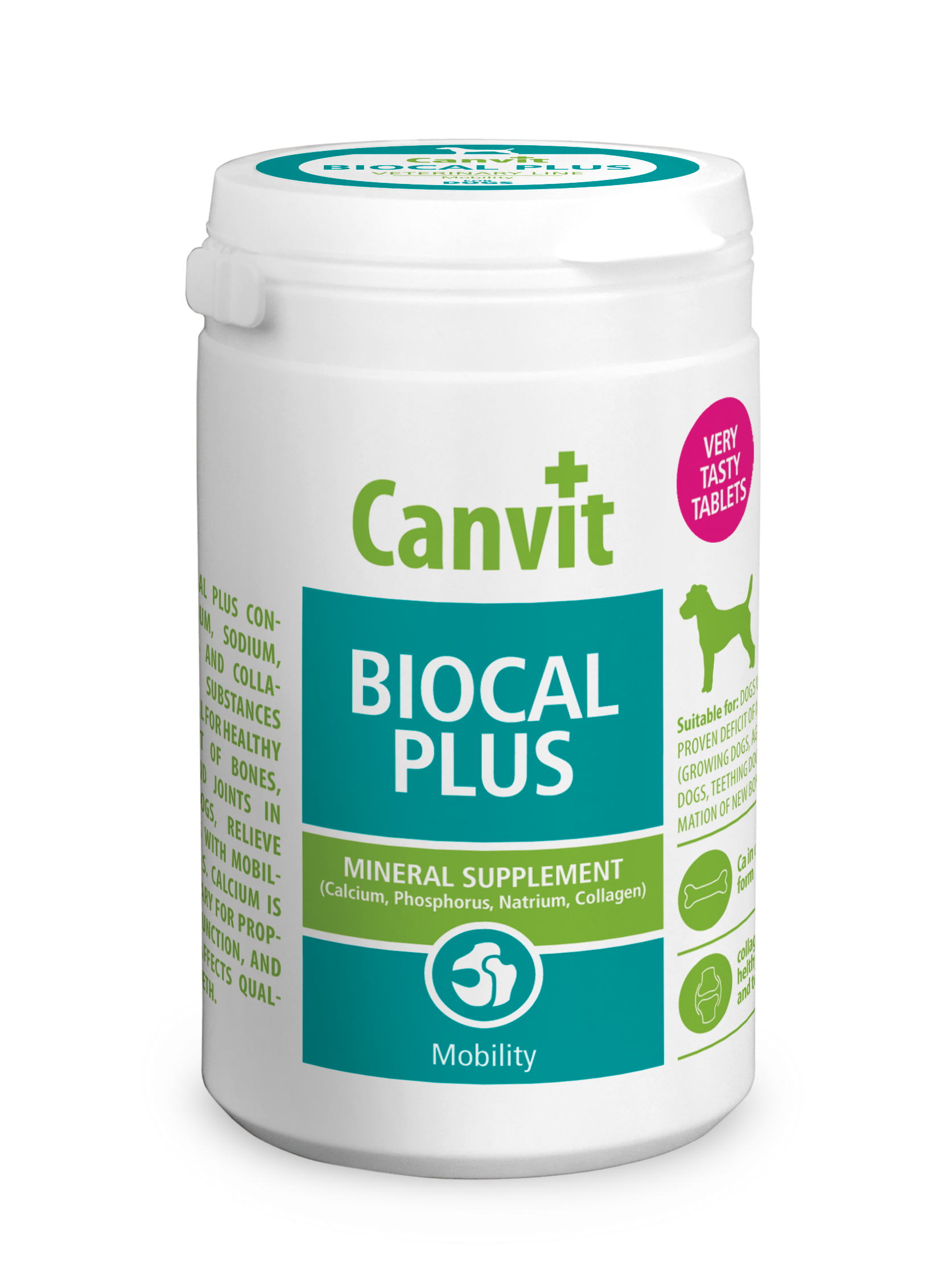 Канвіт Біокаль Плюс містить кальцій, натрій, фосфор і колаген. Ці речовини необхідні для здорового розвитку кісток, сухожилок та суглобів у період росту, покращують рухливість старіючих собак. Кальцій необхідний для правильної функції м’язів, також позитивно впливає на стан здоров’я зубів.