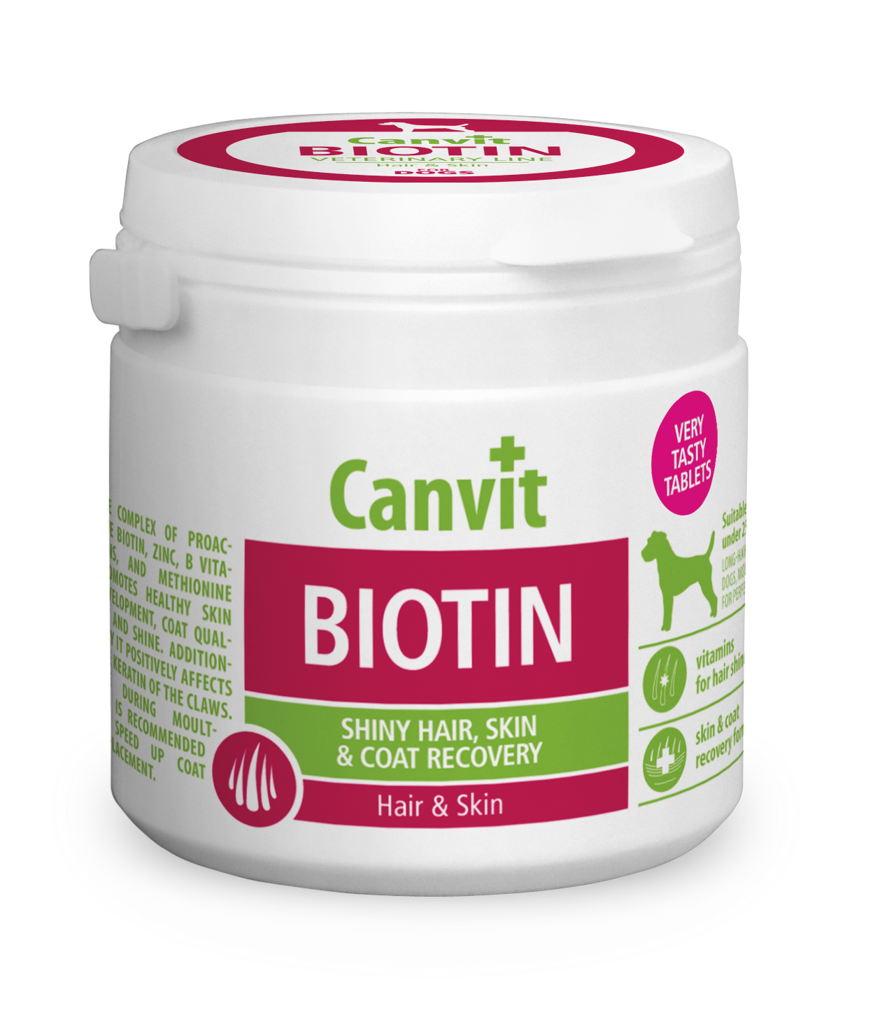 Canvit Biotin for dogs рекомендований собакам масою тіла до 25 кг. Цей комплекс вітамінів підтримує гарний стан шкіри, блиск і якість шерсті, зміцнює кігті. Склад проактивних речовин таких як біотин, цинк, вітаміни групи В і метіонін позитивно впливає на линьку і підтримує гарний стан шкіри, блиск і якість шерсті, зміцнює кігті. Швидке відновлення шерсті під час линьки. Живлення та живий блиск. Підвищений вміст біотину – вітаміну краси та хелату цинку.