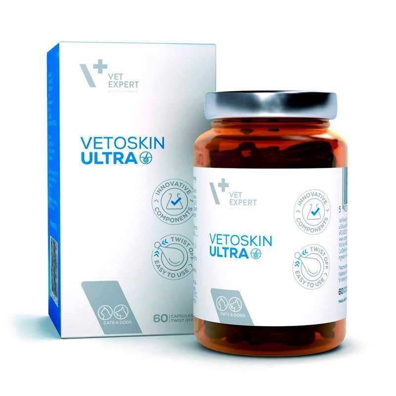 VetExpert VetoSkin Ultra — це харчова добавка у формі капсул, призначена для комплексного захисту, підтримки та регенерації гіперчутливої й атопічної шкіри у котів і собак. Продукт розроблений для тварин із хронічними та гострими дерматологічними проблемами, що супроводжуються свербежем, запаленням і пошкодженням шкіри.