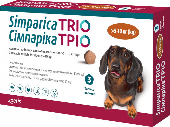 Жувальні таблетки Zoetis Сімпаріка Тріо проти бліх та кліщів для собак вагою від 5.1 до 10 кг.