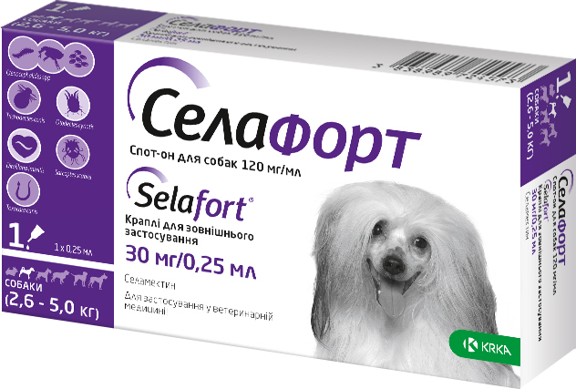 Краплі на холку KRKA Селафорт застосовують для профілактики та лікування собак і котів у разі зараження блохами, вошами, волосоїдами, отодектозом, саркоптозом, дирофіляріозом, токсокарозом, анкілостомозом. Запобігає розмноженню бліх, гальмує розвиток яєць і личинок. Під час лікування: алергічного блошиного дерматиту застосовують один раз на місяць у період активності бліх. У разі отодектозу — одноразово на холку; для профілактики та лікування дирофіляріозу застосовують щомісяця; у разі саркоптозу потрібно застосовувати двічі з інтервалом місяць.