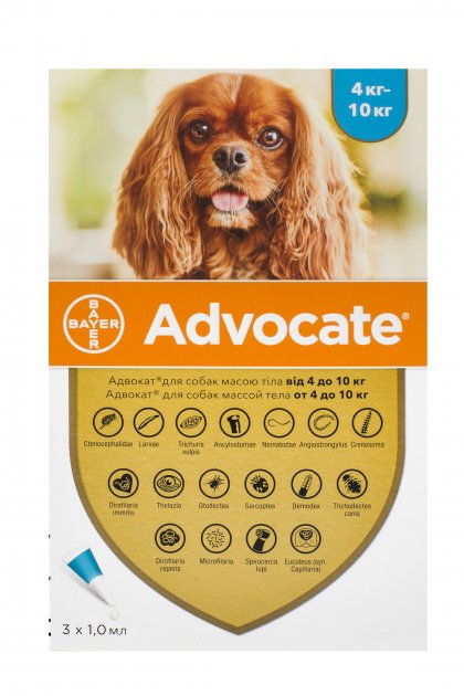 Застосування: Профілактика та лікування собак у разі змішаних паразитарних інвазій. Дозування: Мінімальна рекомендована доза імідаклоприду — 10 мг/кг маси тіла та моксидектину — 2.5 мг/кг маси тіла, що еквівалентно 0,1 мл Адвоката для собак на 1 кг маси тіла. Склад: 1 мл препарату містить активні речовини: • Імідаклоприд- 10% • Моксидектин- 2.5% • Призначення • Для лікування і профілактики • Догляд за вухами • Проти бліх та кліщів • Проти глистів • Універсальне